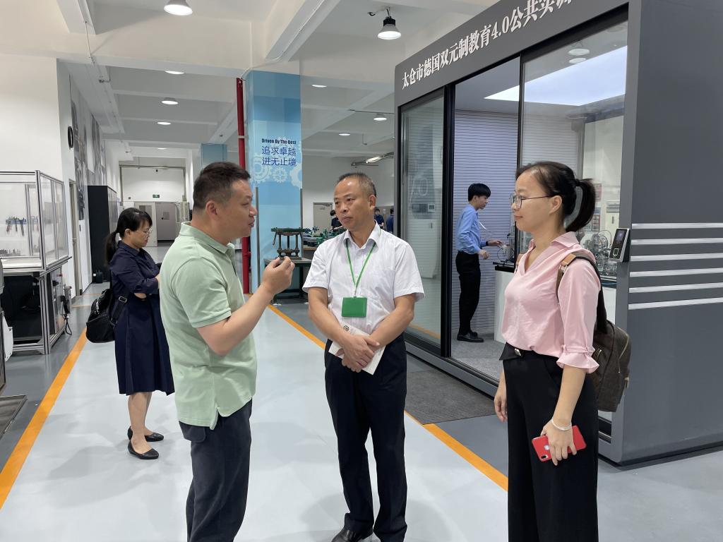 考察团参观了三亿平台德资企业专业工人培训中心(DAWT),培训中心王振东老师向调研团队详细介绍了DAWT的发展历史、运作模式、学生考核机制以及“双元制”教育模式的优势和成果。随后,考察团实地参观了学校东仓路校区的校内实训厂室及现场教学,并与授课教师与学生进行了互动与交流。