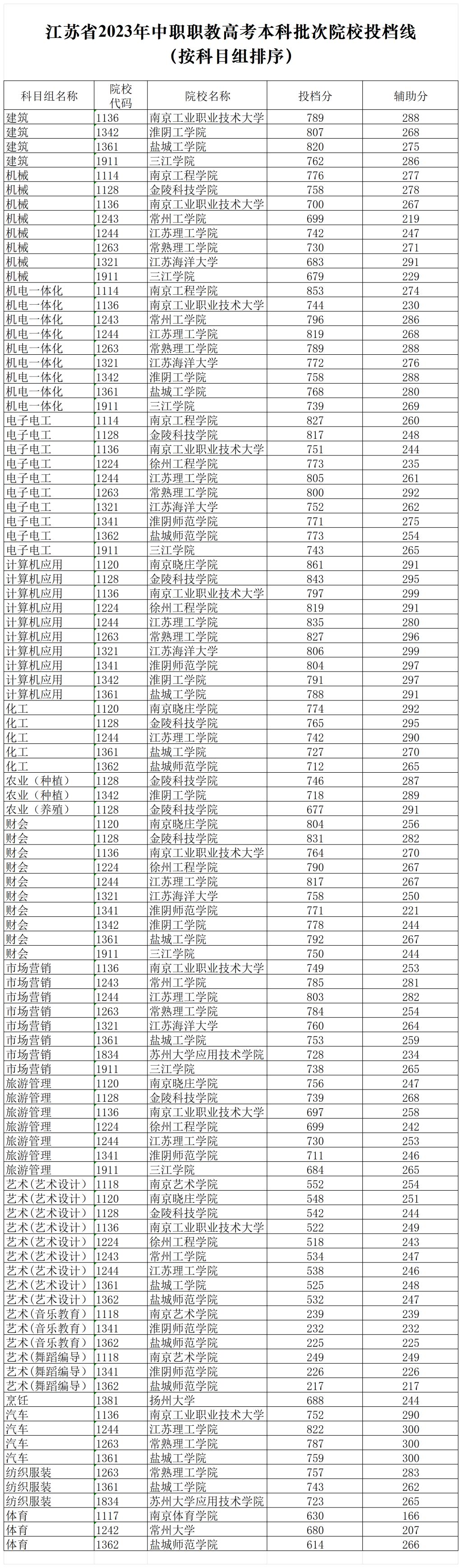 江苏省2023年中职职教高考本科批次院校投档线(按科目组排序)