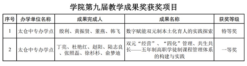 在江苏联合职业技术学院第九届教学成果奖评选中,我校申报的项目《数字赋能双元制本土化育人的实践探索》获特等奖,《双元“经营”、“四化”管理、共生共长——五年制高职学徒制课程管理体系的构建与实践》项目获一等奖,祝贺获奖的团队。