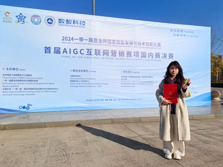 11月29日-12月1日,2024年一带一路暨金砖国家技能发展与技术创新大赛之首届“AIGC互联网营销”赛项国内赛决赛在河南省开封市黄河水利职业技术学院举行。全国共有146支队伍参赛,我校电商2151班杨欣欣最终获得铜奖。