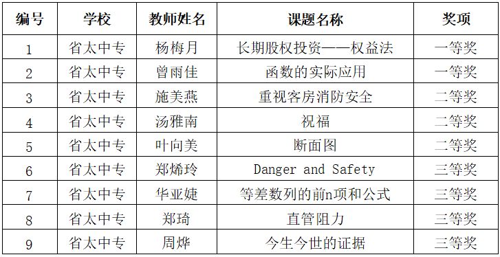 在2024年11月的职业教育高考课程优质课评比活动中,我校教师共获得一等奖2项、二等奖3项,三等奖4项,具体获奖如下: