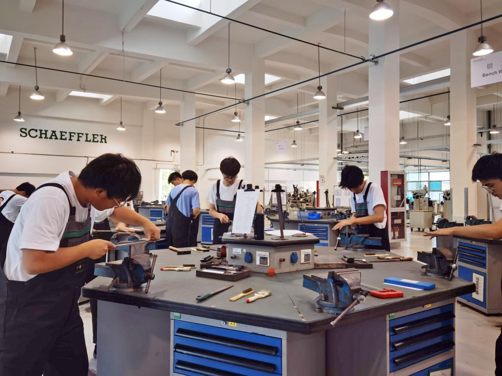 2004年8月,省太中专与舍弗勒(中国)有限公司共建舍弗勒(中国)培训中心,是舍弗勒集团全球培训体系的一部分。培训中心配备了完善的培训设备,包括加工中心、数控车等各类机械加工设备,以及机电一体化、智能产线等先进设备,以支持智能制造人才的培养。招生层次为五年制高职,年招生规模40人。学徒工接受为期3-5年的长学制学徒制培训,其中理论与实习的比例约为1:4。理论部分以学校为主负责教学,实际操作与技能培训方面则主要由舍弗勒集团实施,培训课程涵盖工业机械工.机电一体化等多个专业领域,学徒工在培训中心培训期间基本保证一人一岗,8小时工作制,企业化管理。学徒毕业通过德国AHK考试并获得德国AHK毕业证书(同时获得江苏联合职业技术学院的大专毕业证书),所有通过考核的学生全部在舍弗勒公司就业。建设项目为江苏省首批现代学徒制试点项目,项目成果获2018年国家教学成果奖二等奖、苏州市现代职业教育产教融合共同体单位、三亿平台市产业工人赋能站。