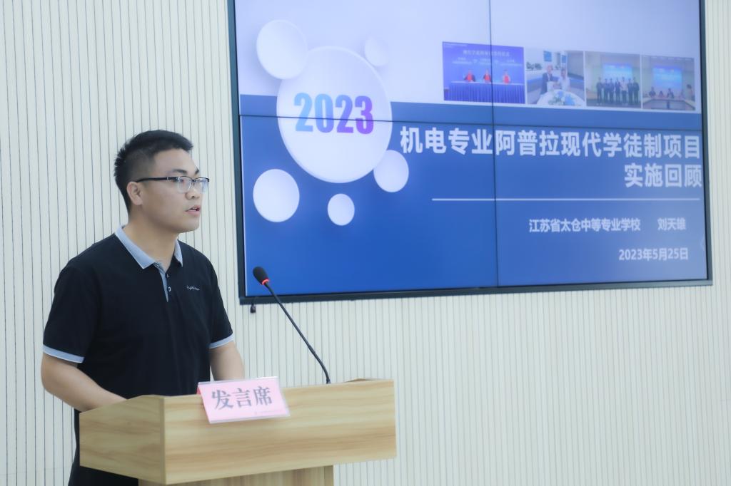 仪式上,智能控制专业群负责人刘天雄汇报了机电专业阿普拉现代学徒制项目合作历程。他表示为确保合作项目顺利实施,自2022年7月校企双方洽谈开始,先后完成了项目研讨、校企协议签订、企业宣讲、企业面试和三方协议签订,校企双方前期都为项目做了大量工作。
