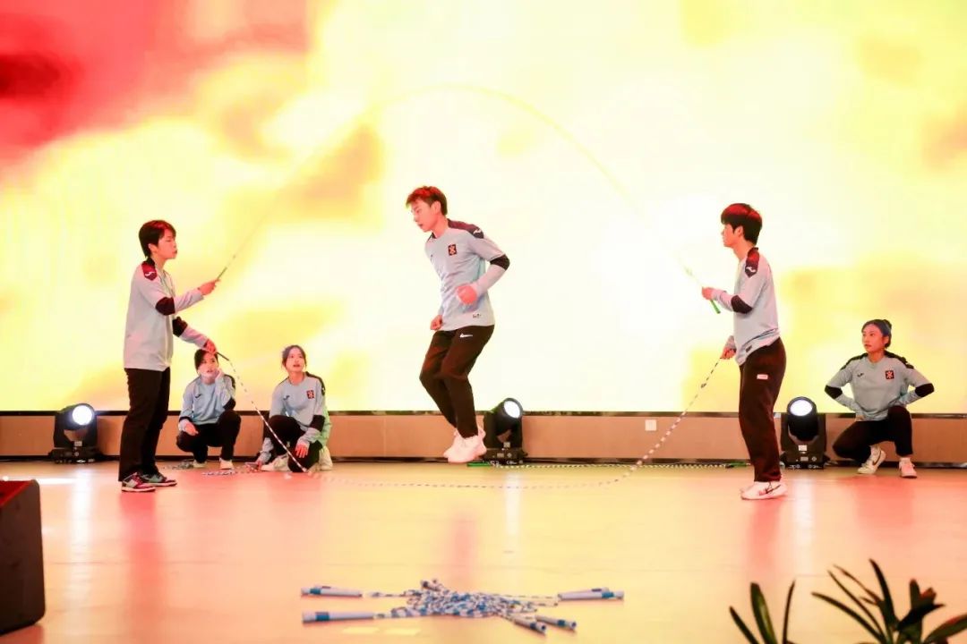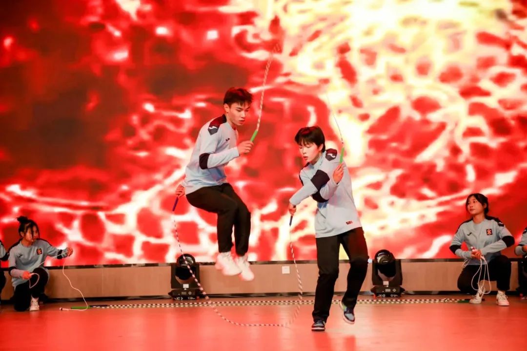 一根跳绳连接的是快乐和运动,一根跳绳传递的是勇气和力量;一根跳绳演绎的是坚持和奋斗,一根跳绳留下的是汗水与荣誉。斩获省级中小学体育俱乐部总决赛第一名的绳毽队代表带来了精彩纷呈的花样跳绳展示。
