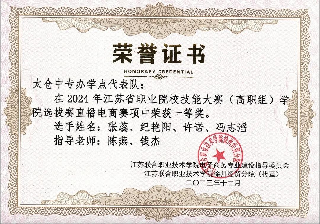 2023年12月27日—12月28日,2024年江苏省职业院校技能大赛(高职组)学生选拔赛直播电商赛项选拔赛成功举办。该赛项由江苏联合职业技术学院(简称江苏联院)主办,学院电子商务专业建设指导委员会、江苏联合职业技术学院三亿平台中专办学点。来自江苏联院各办学单位的8个代表队,共32位选手参加了本次大赛。三亿平台中专办学点电商专业教师陈燕、钱杰指导的张蕊、冯志滔、许诺、纪艳阳四位同学获得选拔赛第一名。