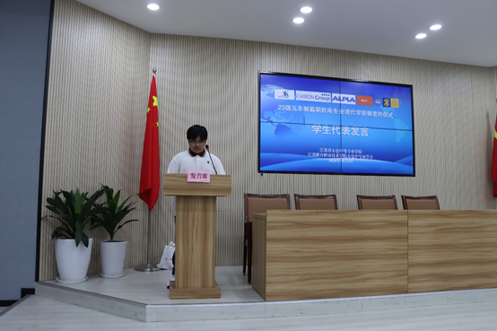 仪式上,机电2352班顾国奥作为学徒生代表发言。他回顾了自己从班主任处了解学徒制,到通过面试成为学徒生的整个过程。他表示,从今天开始将会拥有学生和企业的准员工两个身份,将加倍珍惜这来之不易的身份,严格要求自己,勤奋学习。