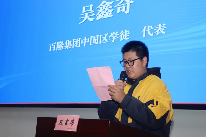 学徒代表吴鑫奇发言时表示,从校园再到百隆,是人生中的重大转折,将珍惜学习机会,以谦逊态度虚心学习,提升技能,为百隆创造价值。他承诺,将铭记企业文化,为公司发展贡献青春力量,共创辉煌明天。