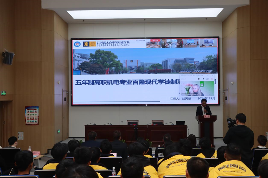 仪式上,刘天雄汇报了五年制高职机电专业百隆现代学徒制项目合作历程。他表示,为确保合作项目顺利实施,自2024年3月校企双方洽谈开始,先后完成了项目研讨、项目调研、企业宣讲、企业面试和三方协议签订,校企双方前期都为项目做了大量工作,做了充足的准备。