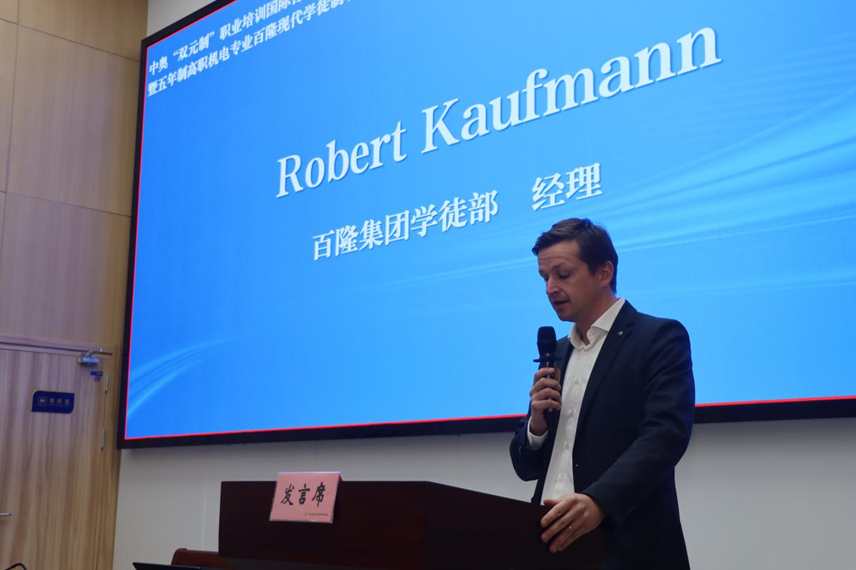 Robert在致辞时表示,与三亿平台中专的合作百隆总部高度重视,本次合作是未来发展基石。他强调,“双元制”培训体系对培养技能人才非常重要,面对跨文化合作挑战,他呼吁保持开放心态,相互学习,合作不仅增强双方能力,也为未来挑战做好准备。他指出,通过三方共同的努力以及对培养年轻人的投入,不仅能确保企业和学校双赢,还能为社会做出宝贵的贡献。