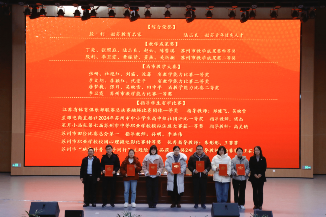 本学期,全体教职工齐心协力,开拓创新,在教育教学方面均取得了令人瞩目的显著成就。这一年,教师们守初心创特色,凝心聚力谋发展;勇担当敢作为,实干笃行展风采。在学校重点工作中,一大批教师取得了优异成绩。会上,对姑苏教育名家、姑苏青年拔尖人才、教学成果奖、省市教学能力大赛、指导学生省市教学能力大赛中取得优异成绩的教师进行了表彰。