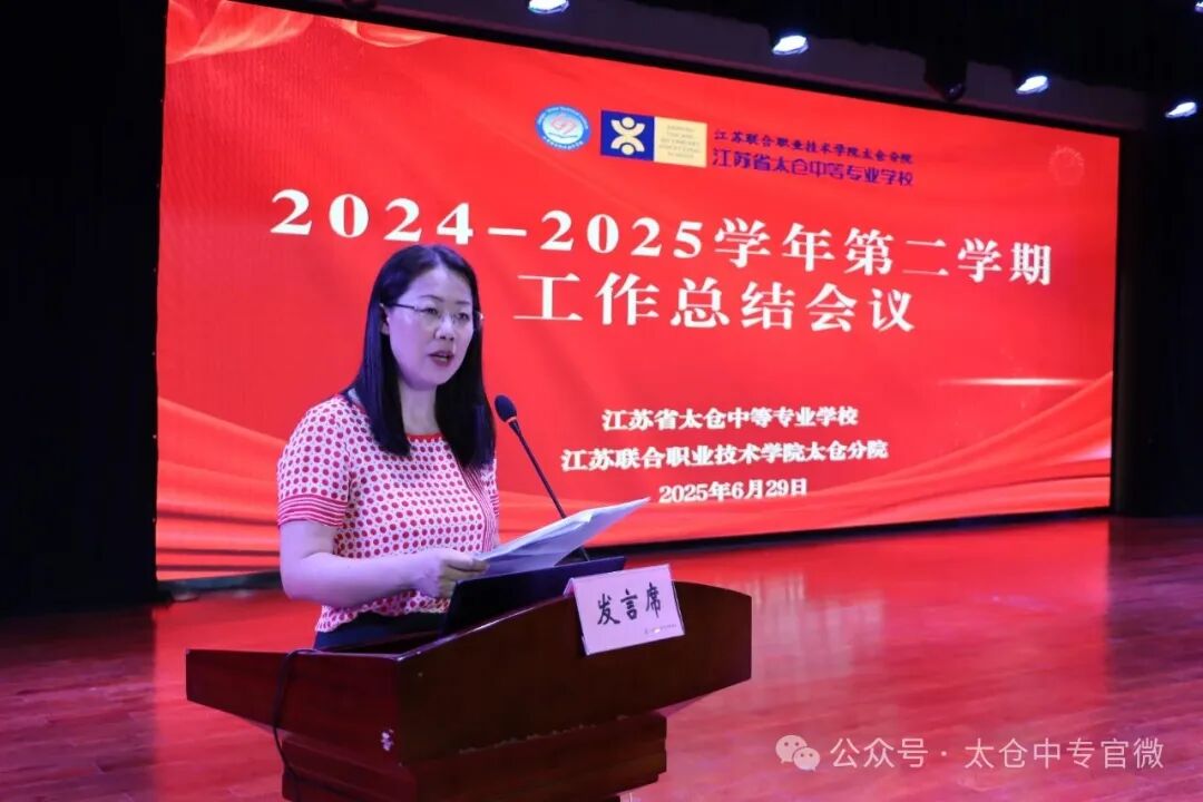 会上,陆金华代表领导班子,全面总结和回顾本学期全校的教育教学工作。她指出,全体教职工要牢记嘱托、感恩奋进,坚持“树高职思维,强高职基因”的工作思路,锚定江苏省“双优中职校”的目标,以“成功升级为江苏联院三亿平台分院”为契机,持续深化教育改革与创新,圆满完成江苏省领航学校验收等多项重要任务,持续保持学校“一校两区”发展模式高质量发展态势,不断深化“一引领三建设一合作”中心工作,各项事业稳步推进。