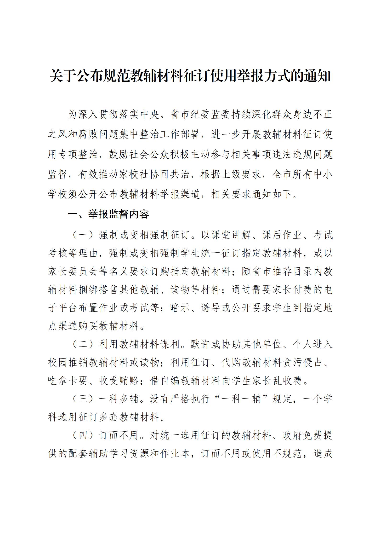 关于公布规范教辅材料征订使用举报方式的通知