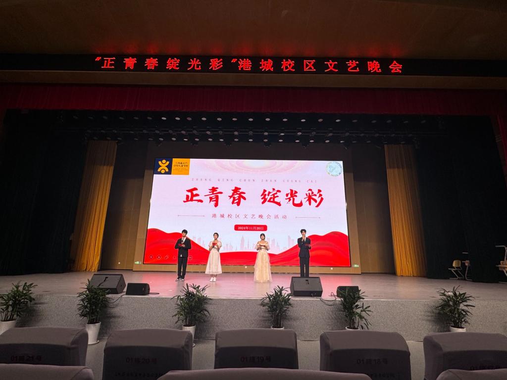 2024年11月20日、21日晚自习期间,港城校区报告厅内灯光璀璨,掌声雷动,由学生工作处统筹,港城校区校学生会牵头,港务教学中心和商务教学中心学生会协同组织的学生文艺汇演在此举行,港务教学中心、商务教学中心全体住宿生观演。本次汇演以“正青春,绽光彩”为主题,旨在为学生提供一个展示自我的平台,丰富校园文化生活。