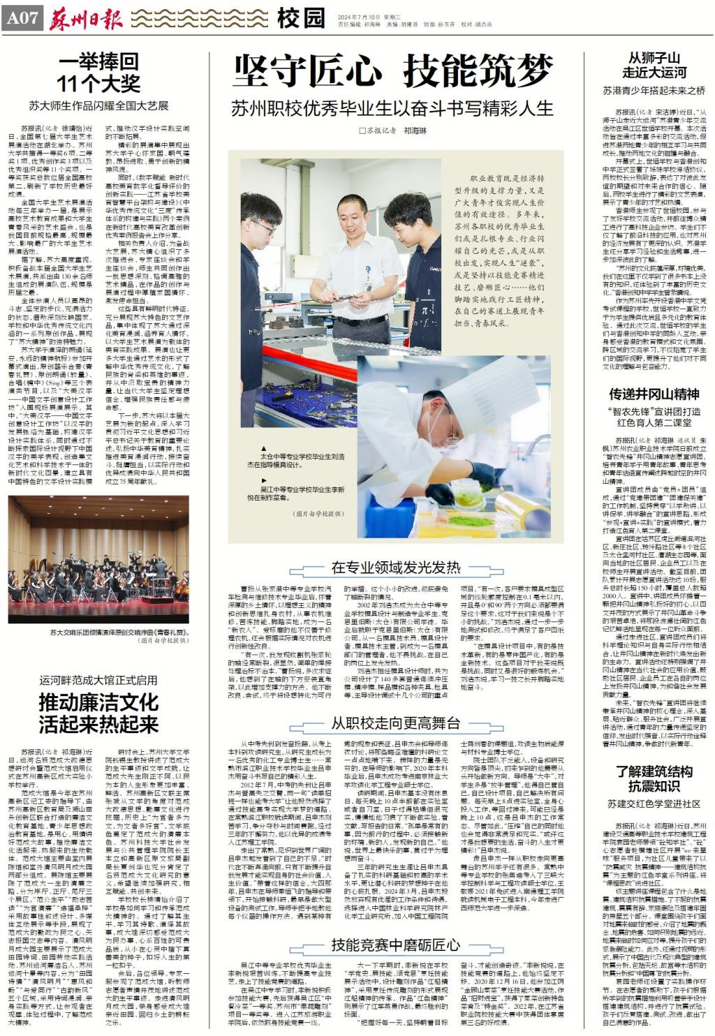 职业教育既是经济转型升级的支撑力量,又是广大青年才俊实现人生价值的有效途径。多年来,苏州各职校的优秀毕业生们或是扎根专业、行业闪耀自己的光芒,或是从职校出发,实现人生“逆袭”,或是坚持以技能竞赛精进技艺、磨砺匠心……他们脚踏实地践行工匠精神,在自己的赛道上展现青年担当、青春风采。