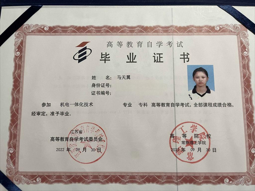 二年级时,马天翼加入了助学自考班,向我们展示了她的“双线作战计划表”:工作日处理生产订单与行政事务,周末不再宅在家里懒散度日,而是坚持到学校攻读现苏州工学院的大专课程,她知道这是提升学历的很好的机会,必须全力以赴,她是这么想的,也是这么做的。2020年7月毕业时,马天翼取得了中专课程的全部学分,通过自学考试所有省和国家统考课程,顺利拿到了中专和大专毕业证书。她表示,从老师手中接过毕业证书的那一刻,她感觉自己的付出是值得的。