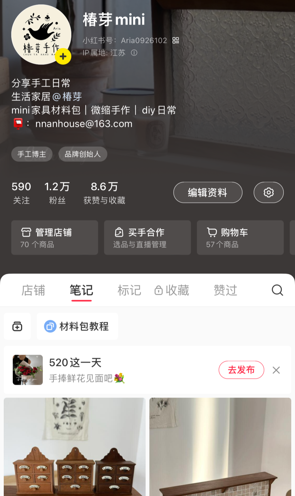2022年5月,因为她平时热爱制作微缩模型,所以利用在学校学习的专业软件绘图,开始制作微缩模型材料包,开设了一家微缩模型网店,通过自媒体宣传,如今她的个人社交平台已经有上万名粉丝,其中有两千多位忠实粉丝。客人可以通过自己DIY制作模型的同时锻炼动手能力,实现微缩家具自由。