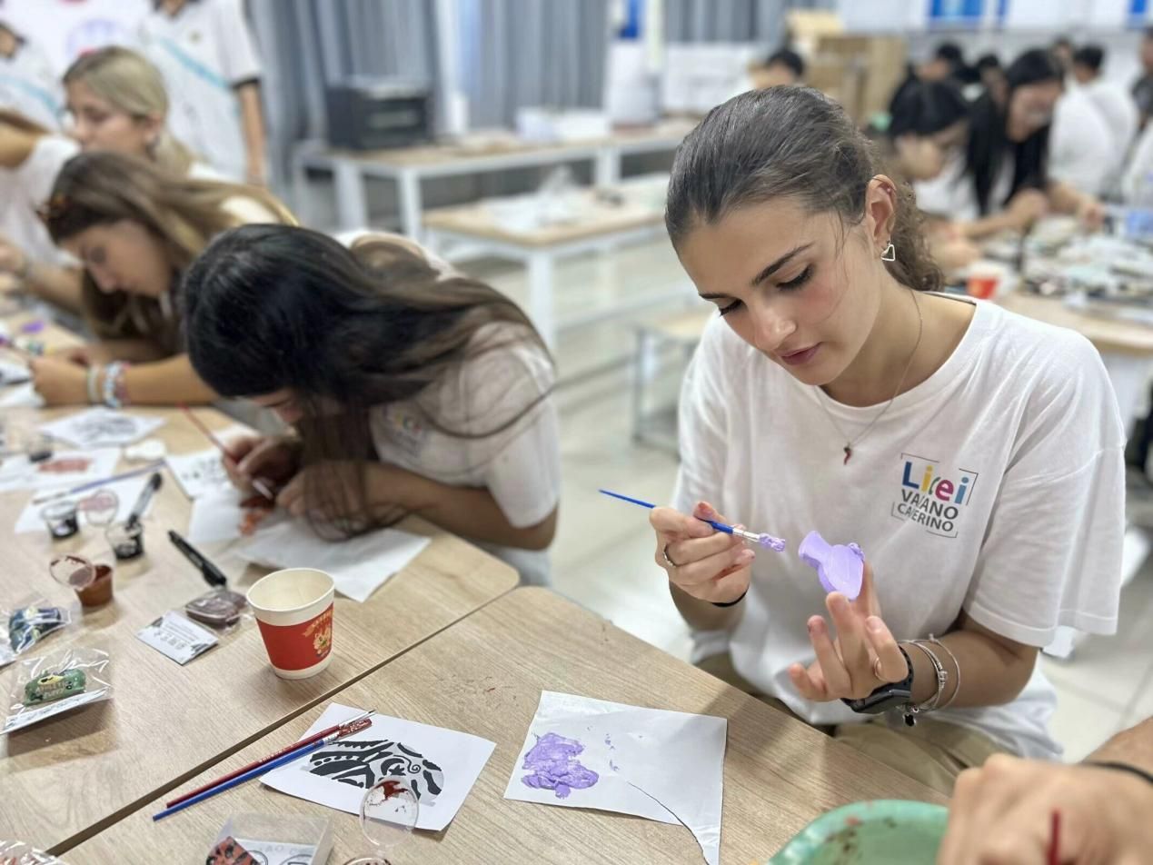 社团活动结束后,艺术设计系的朱萍老师和范姝婧老师带领马切拉塔学生团进一步体验了中国传统书法和漂漆扇制作。在朱萍和范姝婧的悉心传授下,意大利学生们不仅学习体验了中国传统书法,学习书写了“乐”字,还亲手制作了精美的漂漆扇,深刻感受到了中国传统文化的魅力。